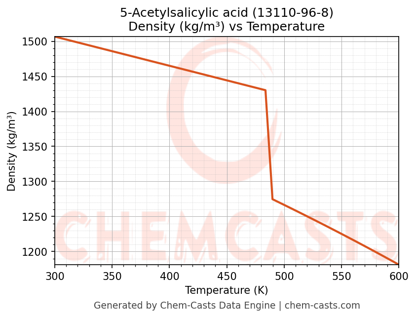 This page presents the temperature-dependent thermodynamic and transport properties of 5-Acetylsalicylic acid (CAS 13110-96-8) calculated at a constant pressure of 1 atm (101325 Pa) over the temperature range 250-500 K.