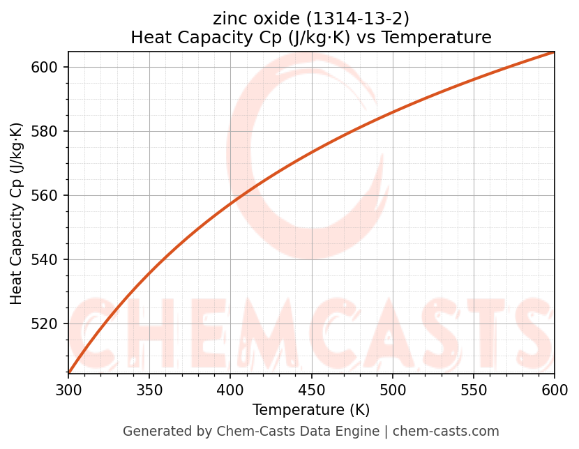 - Specific heat capacity (Cp) indicates the amount of energy required to raise the temperature of zinc oxide and is critical for energy balance and heat-exchanger design.