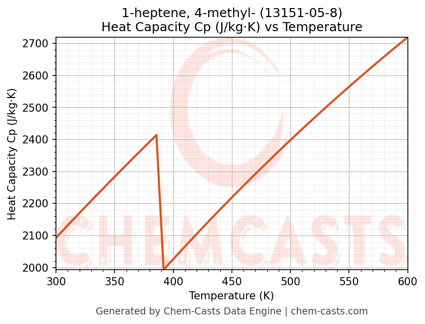 - Specific heat capacity (Cp) indicates the amount of energy required to raise the temperature of 1-heptene, 4-methyl- and is critical for energy balance and heat-exchanger design.
