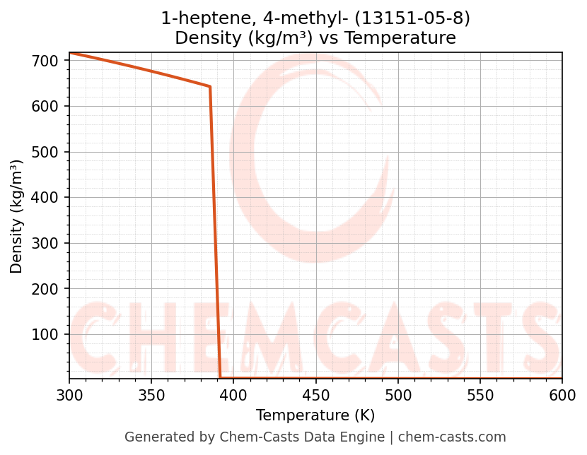 This page presents the temperature-dependent thermodynamic and transport properties of 1-heptene, 4-methyl- (CAS 13151-05-8) calculated at a constant pressure of 1 atm (101325 Pa) over the temperature range 250-500 K.