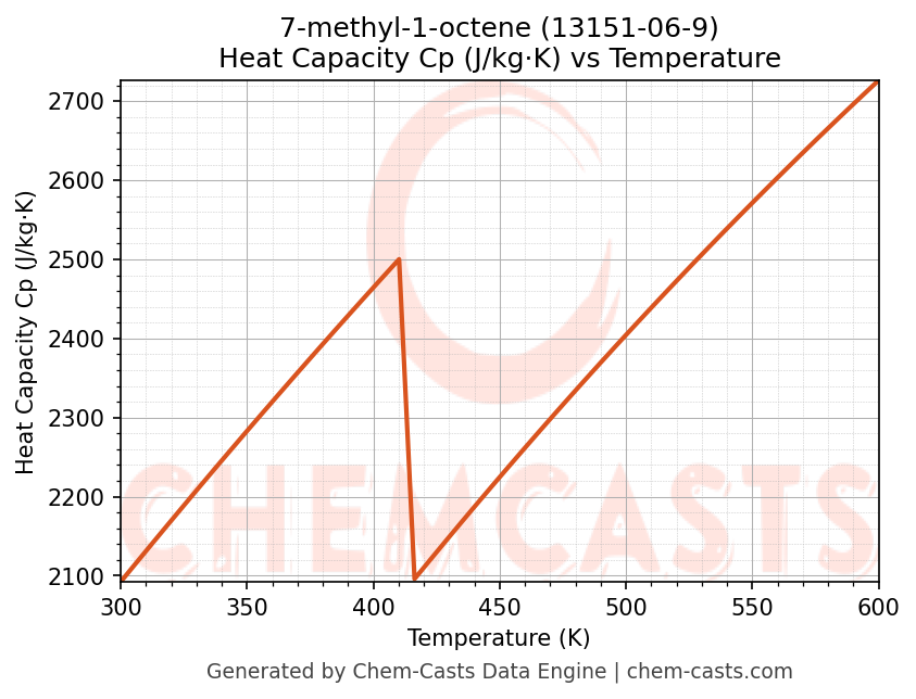 - Specific heat capacity (Cp) indicates the amount of energy required to raise the temperature of 7-methyl-1-octene and is critical for energy balance and heat-exchanger design.