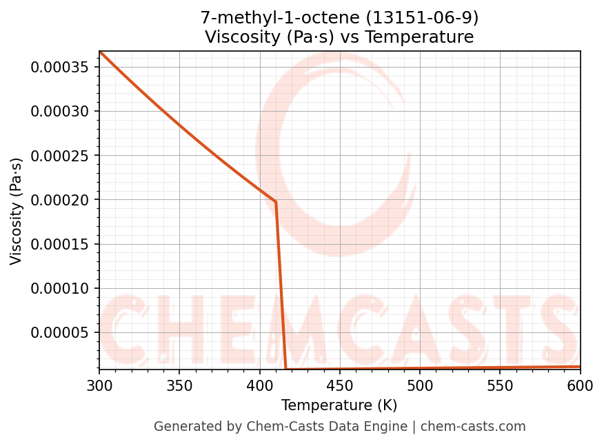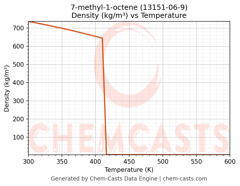 This page presents the temperature-dependent thermodynamic and transport properties of 7-methyl-1-octene (CAS 13151-06-9) calculated at a constant pressure of 1 atm (101325 Pa) over the temperature range 250-500 K.