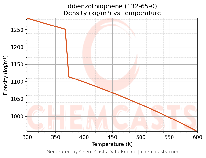 This page presents the temperature-dependent thermodynamic and transport properties of dibenzothiophene (CAS 132-65-0) calculated at a constant pressure of 1 atm (101325 Pa) over the temperature range 250-500 K.