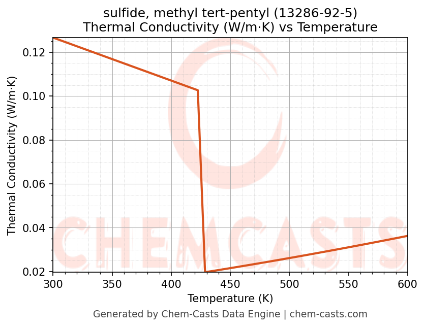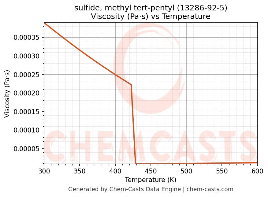 This page presents the temperature-dependent thermodynamic and transport properties of sulfide, methyl tert-pentyl (CAS 13286-92-5) calculated at a constant pressure of 1 atm (101325 Pa) over the temperature range 250-500 K.