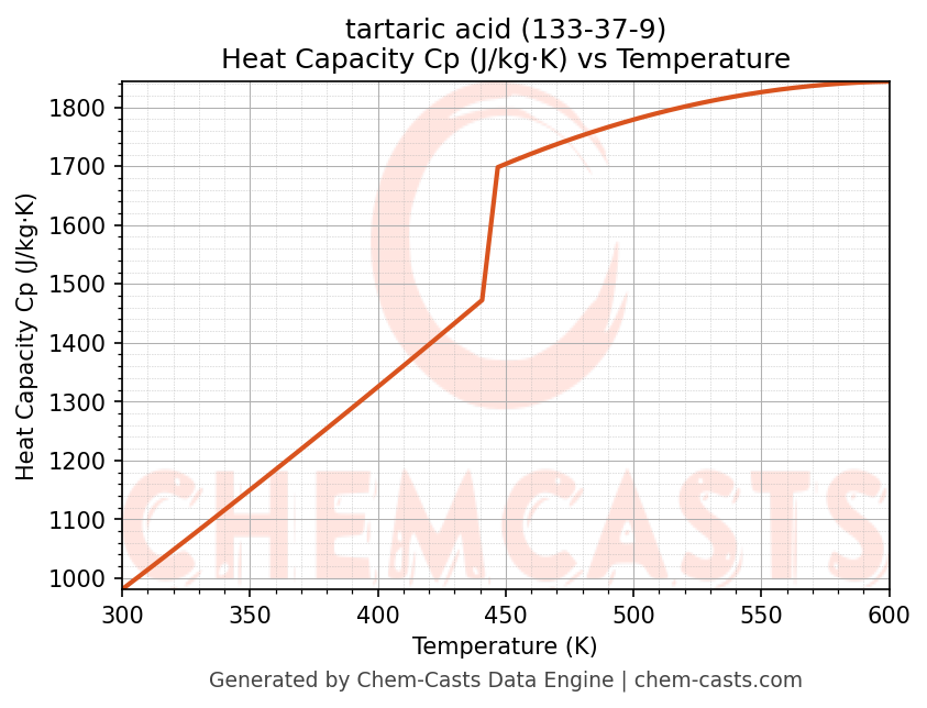 - Specific heat capacity (Cp) indicates the amount of energy required to raise the temperature of tartaric acid and is critical for energy balance and heat-exchanger design.