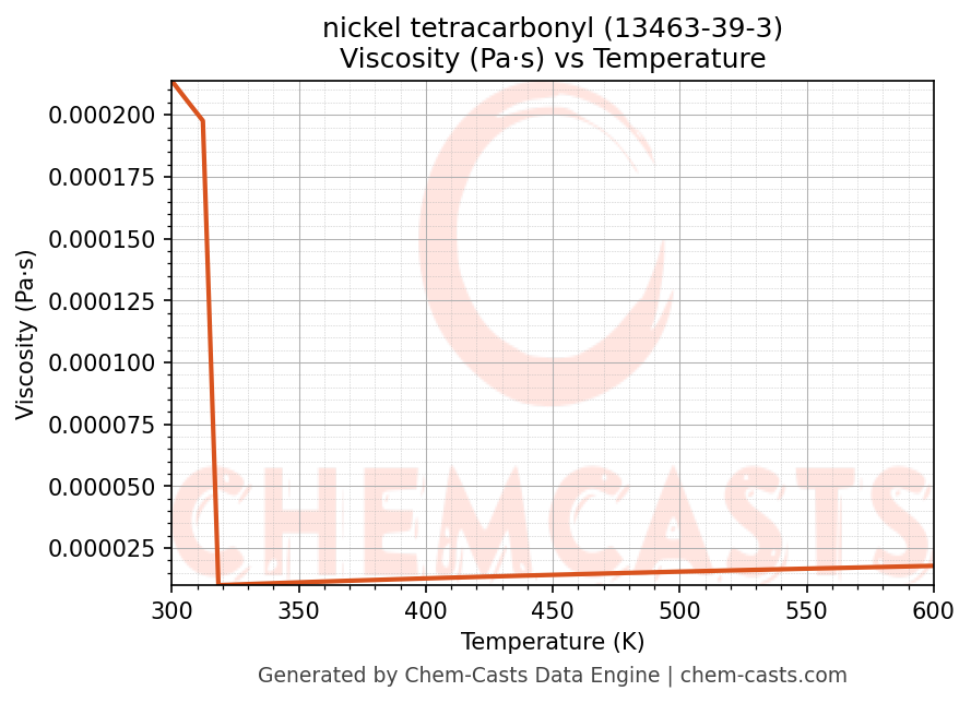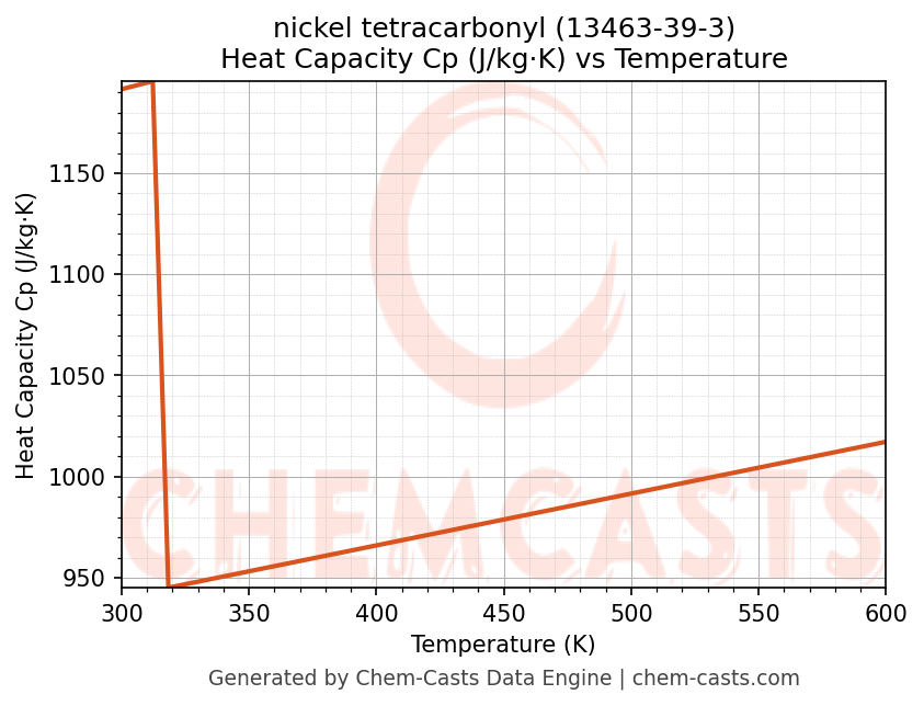 - Specific heat capacity (Cp) indicates the amount of energy required to raise the temperature of nickel tetracarbonyl and is critical for energy balance and heat-exchanger design.
