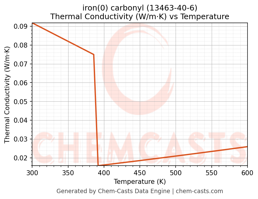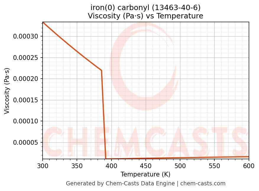 This page presents the temperature-dependent thermodynamic and transport properties of iron(0) carbonyl (CAS 13463-40-6) calculated at a constant pressure of 1 atm (101325 Pa) over the temperature range 250-500 K.