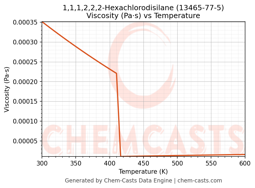 This page presents the temperature-dependent thermodynamic and transport properties of 1,1,1,2,2,2-Hexachlorodisilane (CAS 13465-77-5) calculated at a constant pressure of 1 atm (101325 Pa) over the temperature range 250-500 K.