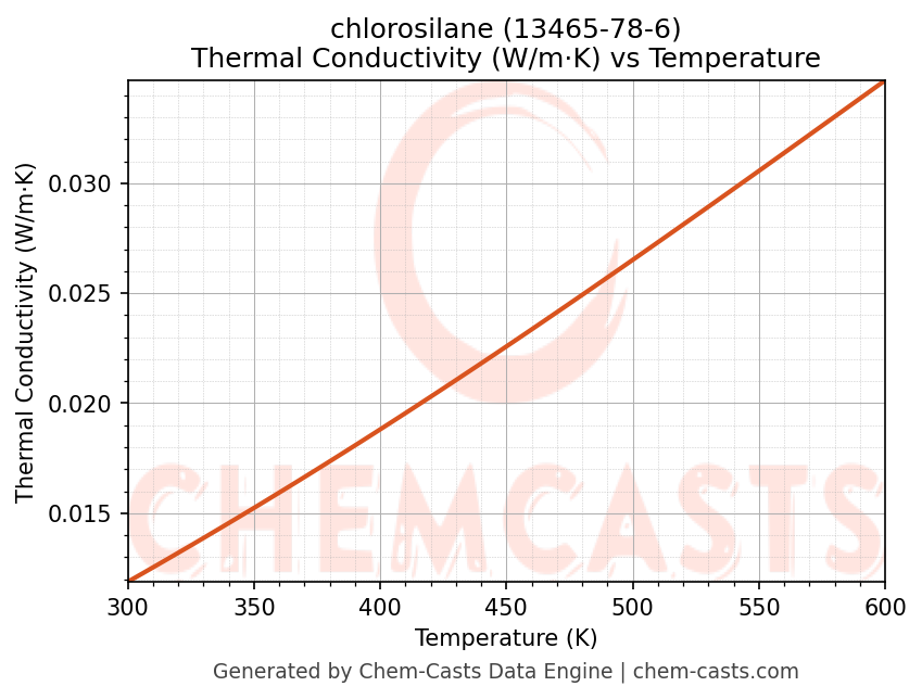 This page presents the temperature-dependent thermodynamic and transport properties of chlorosilane (CAS 13465-78-6) calculated at a constant pressure of 1 atm (101325 Pa) over the temperature range 250-500 K.