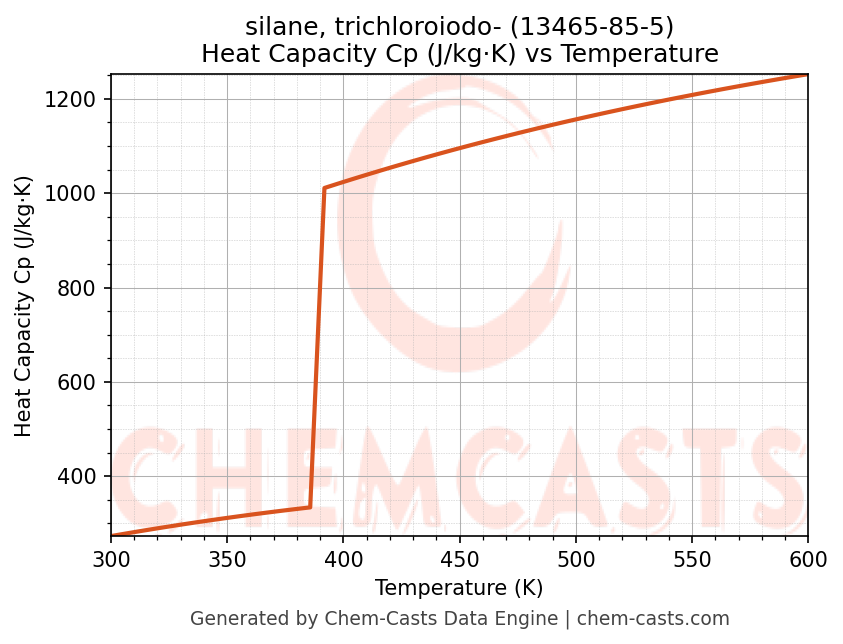 - Specific heat capacity (Cp) indicates the amount of energy required to raise the temperature of silane, trichloroiodo- and is critical for energy balance and heat-exchanger design.