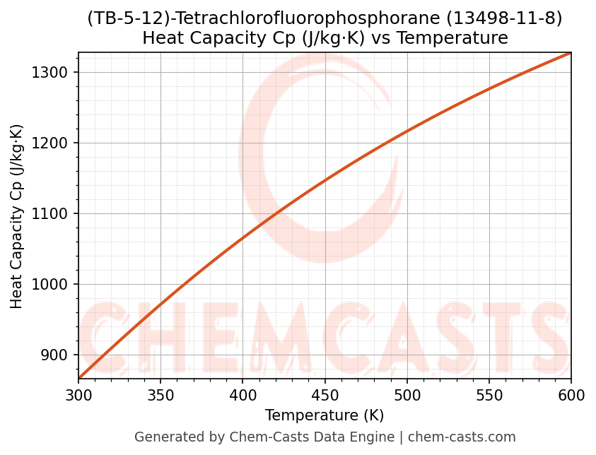 - Specific heat capacity (Cp) indicates the amount of energy required to raise the temperature of (TB-5-12)-Tetrachlorofluorophosphorane and is critical for energy balance and heat-exchanger design.
