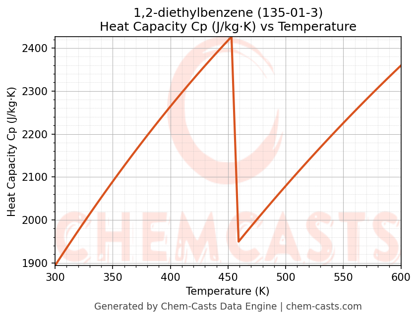 - Specific heat capacity (Cp) indicates the amount of energy required to raise the temperature of 1,2-diethylbenzene and is critical for energy balance and heat-exchanger design.