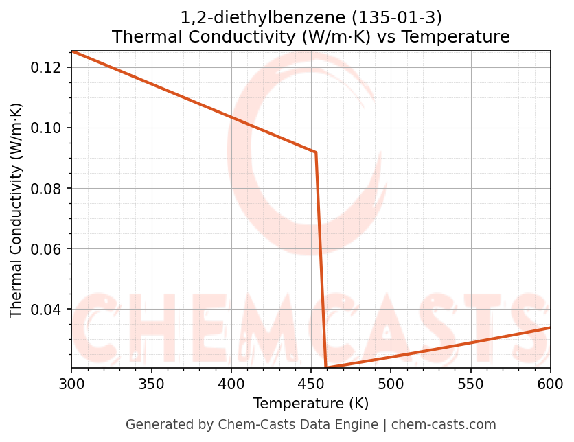 This page presents the temperature-dependent thermodynamic and transport properties of 1,2-diethylbenzene (CAS 135-01-3) calculated at a constant pressure of 1 atm (101325 Pa) over the temperature range 250-500 K.