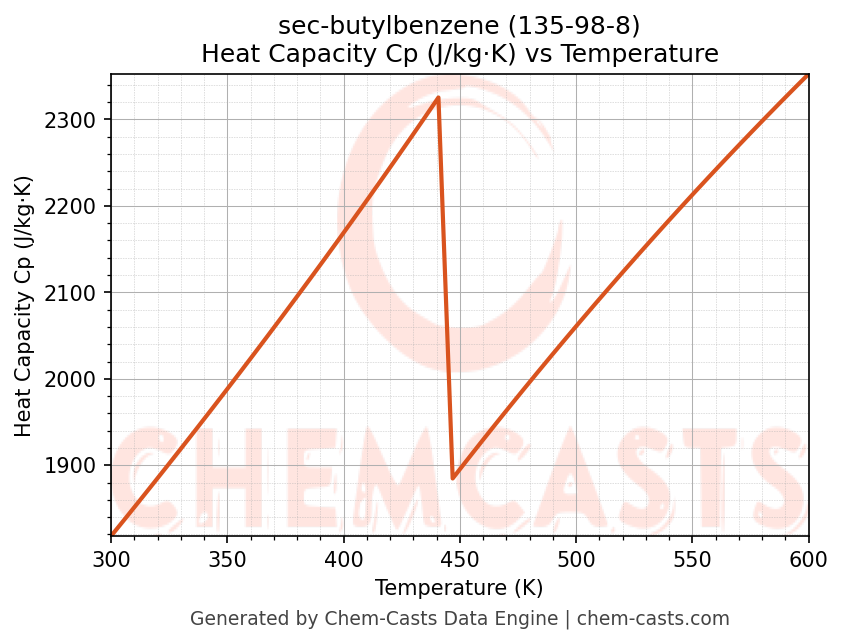 - Specific heat capacity (Cp) indicates the amount of energy required to raise the temperature of sec-butylbenzene and is critical for energy balance and heat-exchanger design.