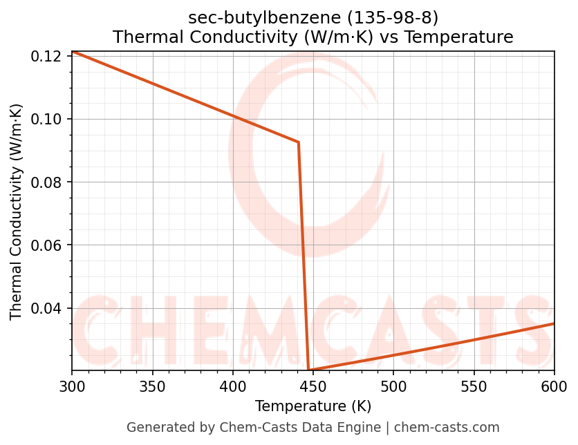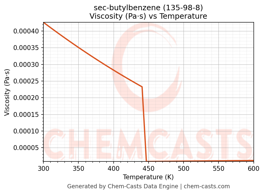 This page presents the temperature-dependent thermodynamic and transport properties of sec-butylbenzene (CAS 135-98-8) calculated at a constant pressure of 1 atm (101325 Pa) over the temperature range 250-500 K.