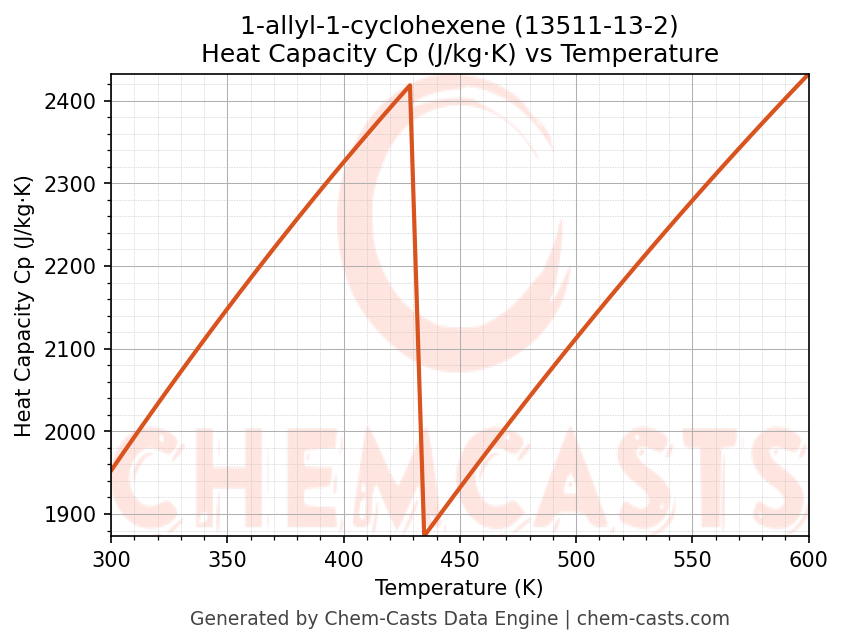 - Specific heat capacity (Cp) indicates the amount of energy required to raise the temperature of 1-allyl-1-cyclohexene and is critical for energy balance and heat-exchanger design.