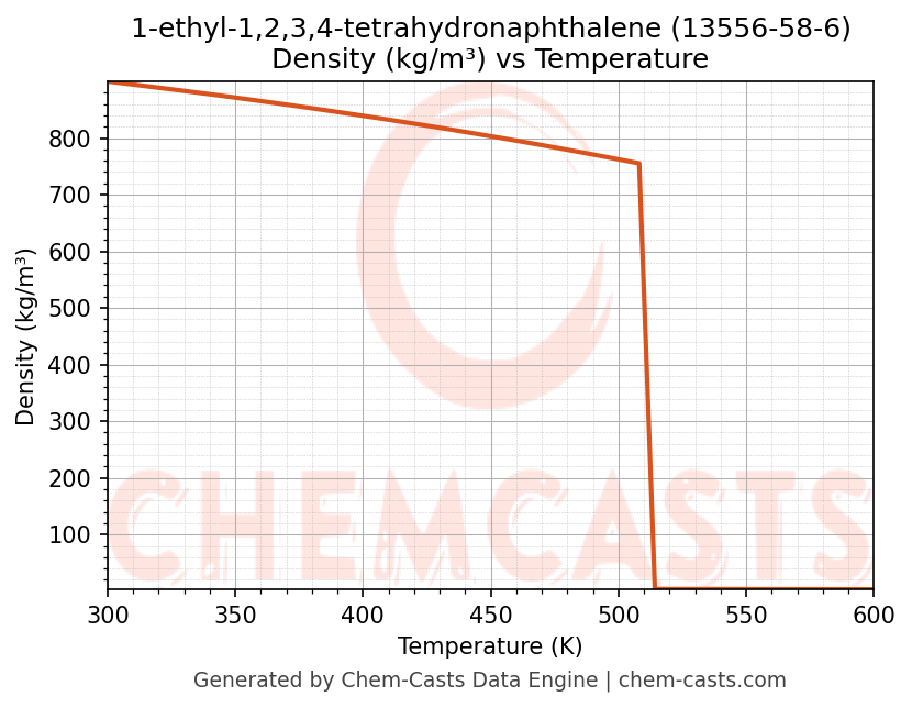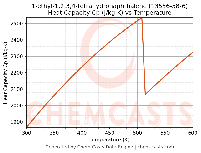 - Specific heat capacity (Cp) indicates the amount of energy required to raise the temperature of 1-ethyl-1,2,3,4-tetrahydronaphthalene and is critical for energy balance and heat-exchanger design.