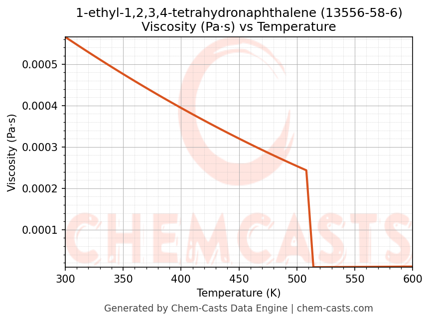This page presents the temperature-dependent thermodynamic and transport properties of 1-ethyl-1,2,3,4-tetrahydronaphthalene (CAS 13556-58-6) calculated at a constant pressure of 1 atm (101325 Pa) over the temperature range 250-500 K.