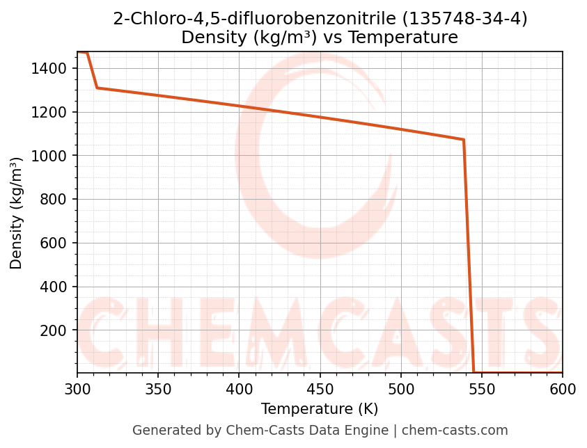 This page presents the temperature-dependent thermodynamic and transport properties of 2-Chloro-4,5-difluorobenzonitrile (CAS 135748-34-4) calculated at a constant pressure of 1 atm (101325 Pa) over the temperature range 250-500 K.