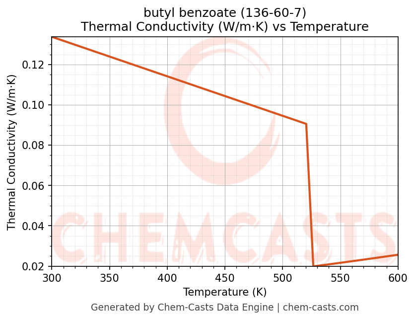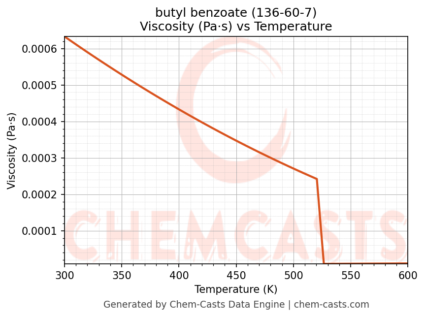 This page presents the temperature-dependent thermodynamic and transport properties of butyl benzoate (CAS 136-60-7) calculated at a constant pressure of 1 atm (101325 Pa) over the temperature range 250-500 K.
