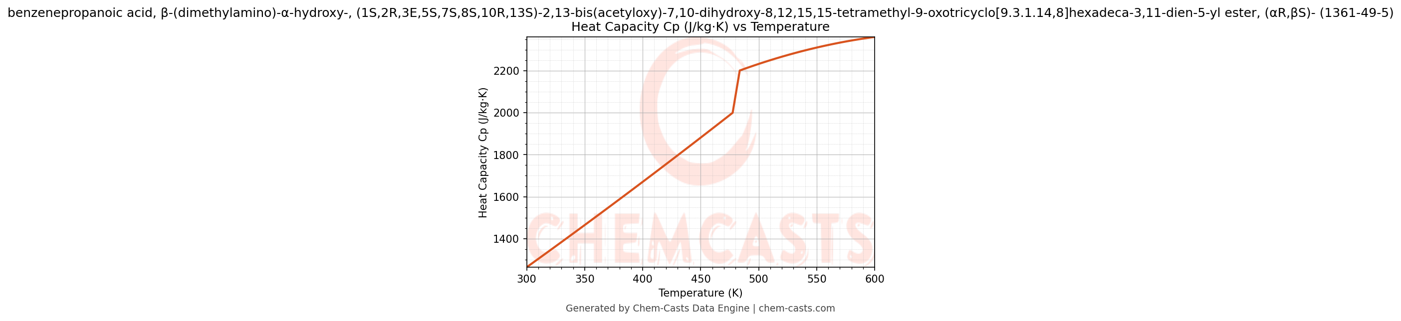 ![Heat Capacity (Cp) vs Temperature chart for benzenepropanoic acid, β-(dimethylamino)-α-hydroxy-, (1S,2R,3E,5S,7S,8S,10R,13S)-2,13-bis(acetyloxy)-7,10-dihydroxy-8,12,15,15-tetramethyl-9-oxotricyclo[9.3.1.14,8]hexadeca-3,11-dien-5-yl ester, (αR,βS)- (CAS 1361-49-5)](https://chemcasts-prod.s3.ap-south-1.amazonaws.com/chem_plots_pconst/1361-49-5-cp.png)