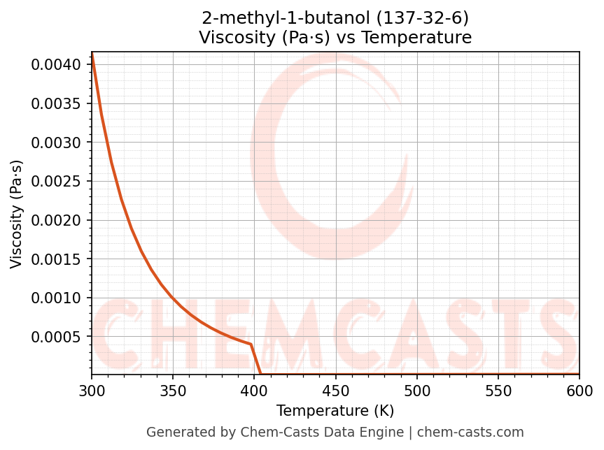 This page presents the temperature-dependent thermodynamic and transport properties of 2-methyl-1-butanol (CAS 137-32-6) calculated at a constant pressure of 1 atm (101325 Pa) over the temperature range 250-500 K.