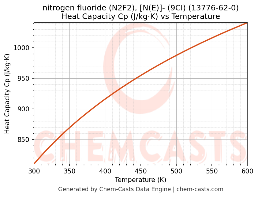 - Specific heat capacity (Cp) indicates the amount of energy required to raise the temperature of nitrogen fluoride (N2F2), [N(E)]- (9CI) and is critical for energy balance and heat-exchanger design.