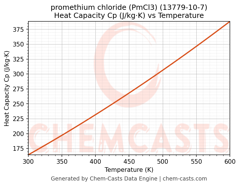 - Specific heat capacity (Cp) indicates the amount of energy required to raise the temperature of promethium chloride (PmCl3) and is critical for energy balance and heat-exchanger design.