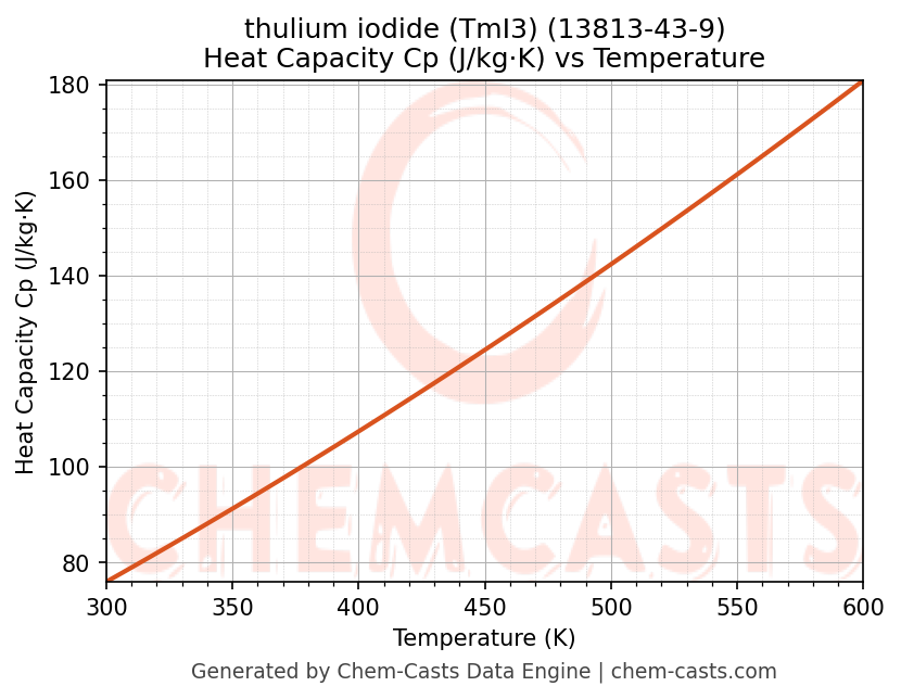 - Specific heat capacity (Cp) indicates the amount of energy required to raise the temperature of thulium iodide (TmI3) and is critical for energy balance and heat-exchanger design.