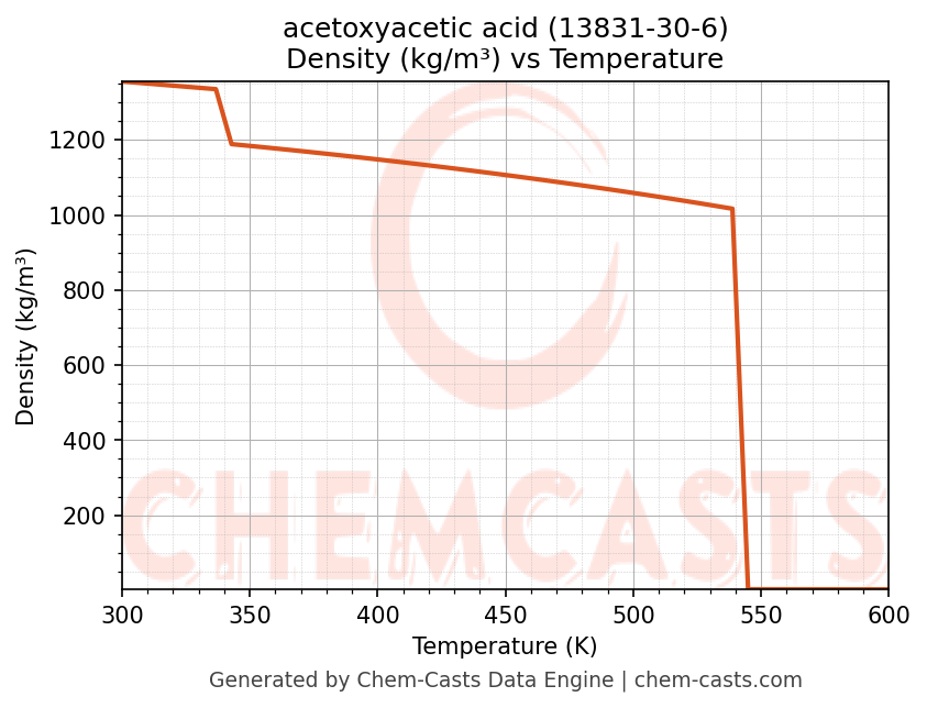This page presents the temperature-dependent thermodynamic and transport properties of acetoxyacetic acid (CAS 13831-30-6) calculated at a constant pressure of 1 atm (101325 Pa) over the temperature range 250-500 K.