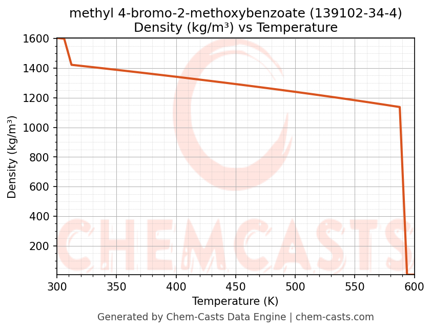 This page presents the temperature-dependent thermodynamic and transport properties of methyl 4-bromo-2-methoxybenzoate (CAS 139102-34-4) calculated at a constant pressure of 1 atm (101325 Pa) over the temperature range 250-500 K.