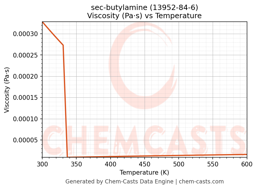 This page presents the temperature-dependent thermodynamic and transport properties of sec-butylamine (CAS 13952-84-6) calculated at a constant pressure of 1 atm (101325 Pa) over the temperature range 250-500 K.