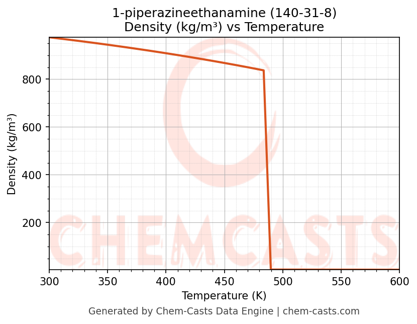 This page presents the temperature-dependent thermodynamic and transport properties of 1-piperazineethanamine (CAS 140-31-8) calculated at a constant pressure of 1 atm (101325 Pa) over the temperature range 250-500 K.