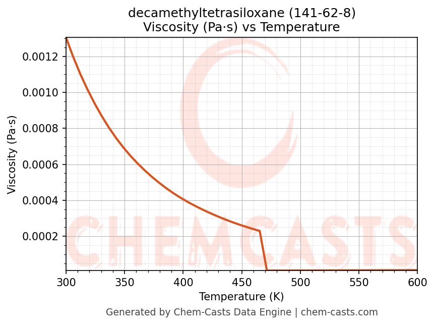This page presents the temperature-dependent thermodynamic and transport properties of decamethyltetrasiloxane (CAS 141-62-8) calculated at a constant pressure of 1 atm (101325 Pa) over the temperature range 250-500 K.