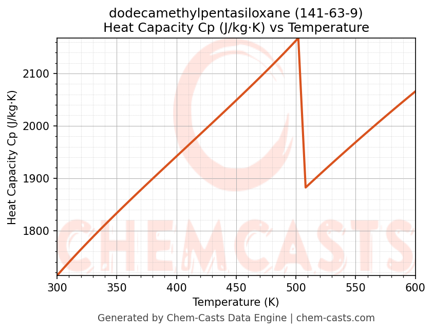 - Specific heat capacity (Cp) indicates the amount of energy required to raise the temperature of dodecamethylpentasiloxane and is critical for energy balance and heat-exchanger design.