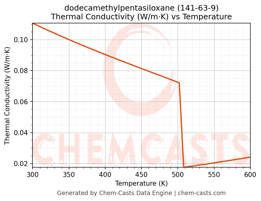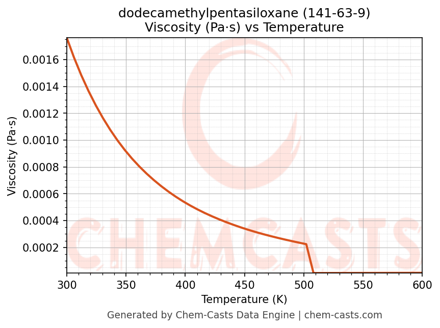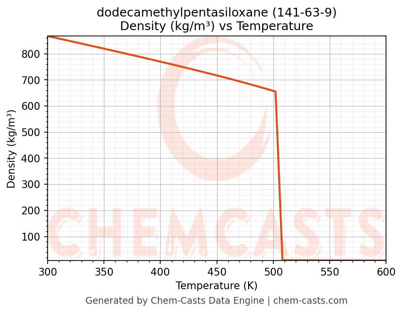 This page presents the temperature-dependent thermodynamic and transport properties of dodecamethylpentasiloxane (CAS 141-63-9) calculated at a constant pressure of 1 atm (101325 Pa) over the temperature range 250-500 K.