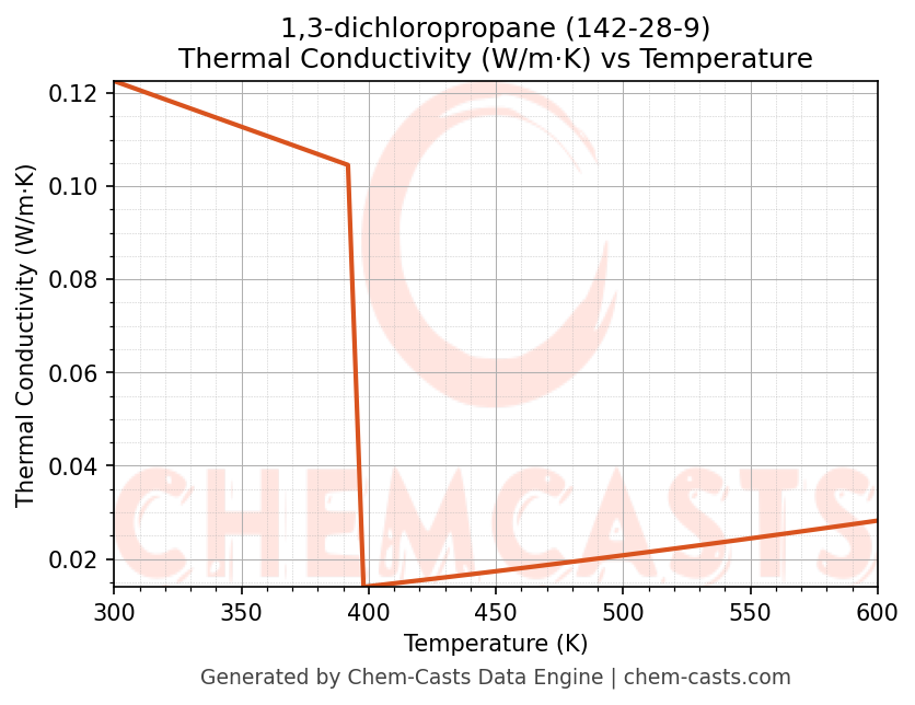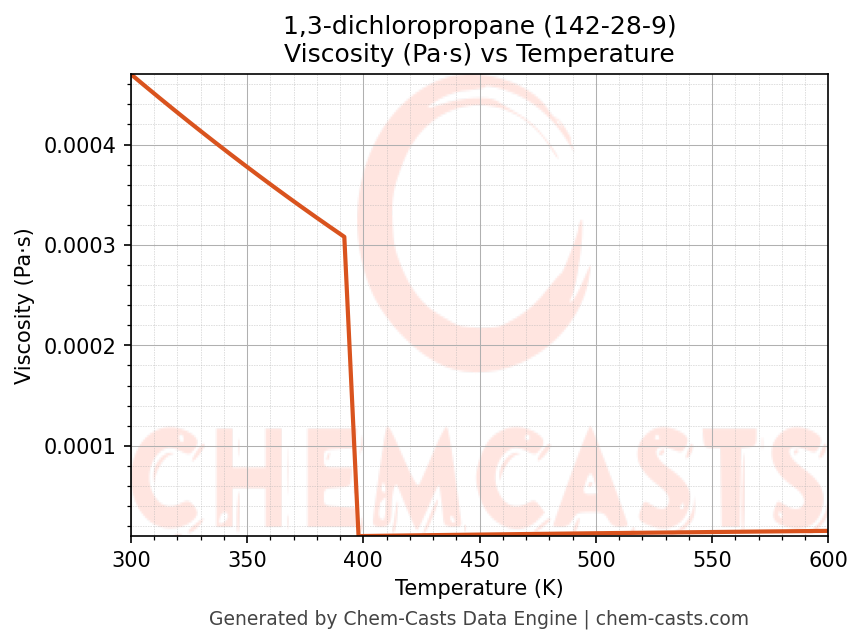 This page presents the temperature-dependent thermodynamic and transport properties of 1,3-dichloropropane (CAS 142-28-9) calculated at a constant pressure of 1 atm (101325 Pa) over the temperature range 250-500 K.