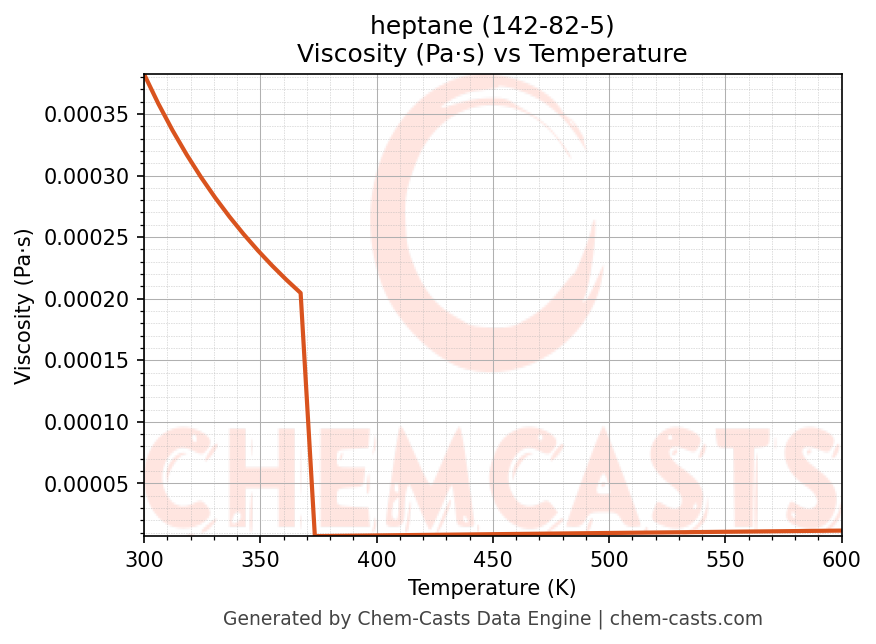 This page presents the temperature-dependent thermodynamic and transport properties of heptane (CAS 142-82-5) calculated at a constant pressure of 1 atm (101325 Pa) over the temperature range 250-500 K.