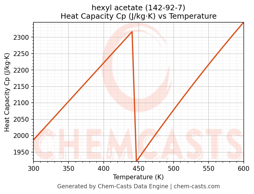 - Specific heat capacity (Cp) indicates the amount of energy required to raise the temperature of hexyl acetate and is critical for energy balance and heat-exchanger design.
