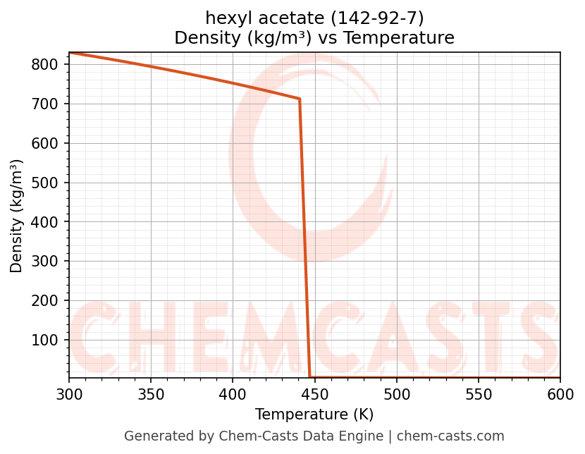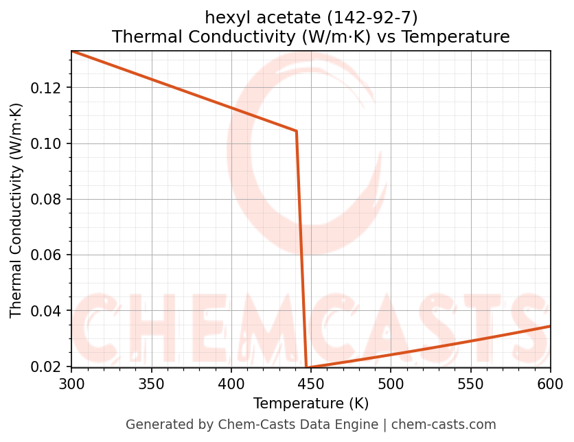 This page presents the temperature-dependent thermodynamic and transport properties of hexyl acetate (CAS 142-92-7) calculated at a constant pressure of 1 atm (101325 Pa) over the temperature range 250-500 K.