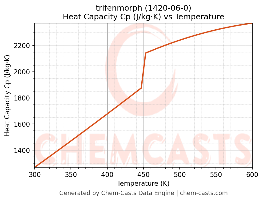 - Specific heat capacity (Cp) indicates the amount of energy required to raise the temperature of trifenmorph and is critical for energy balance and heat-exchanger design.