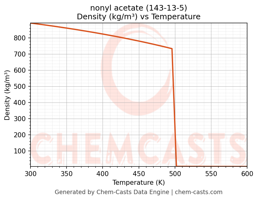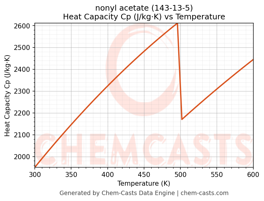 - Specific heat capacity (Cp) indicates the amount of energy required to raise the temperature of nonyl acetate and is critical for energy balance and heat-exchanger design.