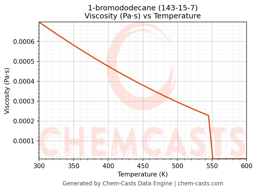 This page presents the temperature-dependent thermodynamic and transport properties of 1-bromododecane (CAS 143-15-7) calculated at a constant pressure of 1 atm (101325 Pa) over the temperature range 250-500 K.