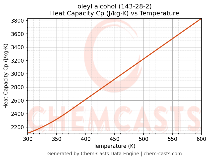 - Specific heat capacity (Cp) indicates the amount of energy required to raise the temperature of oleyl alcohol and is critical for energy balance and heat-exchanger design.