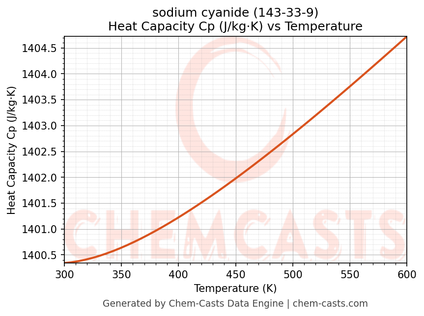 - Specific heat capacity (Cp) indicates the amount of energy required to raise the temperature of sodium cyanide and is critical for energy balance and heat-exchanger design.