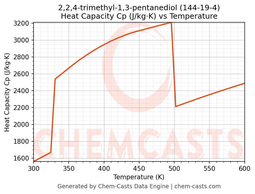 - Specific heat capacity (Cp) indicates the amount of energy required to raise the temperature of 2,2,4-trimethyl-1,3-pentanediol and is critical for energy balance and heat-exchanger design.