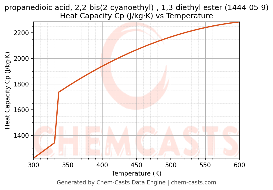 - Specific heat capacity (Cp) indicates the amount of energy required to raise the temperature of propanedioic acid, 2,2-bis(2-cyanoethyl)-, 1,3-diethyl ester and is critical for energy balance and heat-exchanger design.