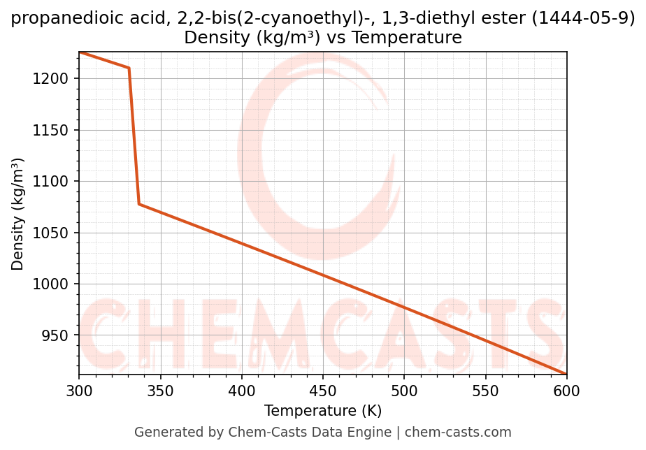 This page presents the temperature-dependent thermodynamic and transport properties of propanedioic acid, 2,2-bis(2-cyanoethyl)-, 1,3-diethyl ester (CAS 1444-05-9) calculated at a constant pressure of 1 atm (101325 Pa) over the temperature range 250-500 K.