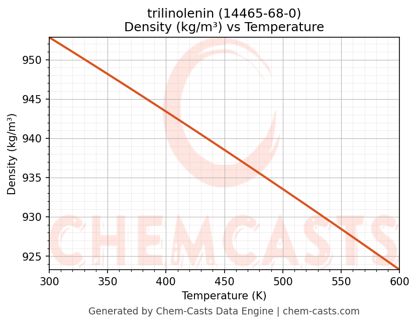 This page presents the temperature-dependent thermodynamic and transport properties of trilinolenin (CAS 14465-68-0) calculated at a constant pressure of 1 atm (101325 Pa) over the temperature range 250-500 K.