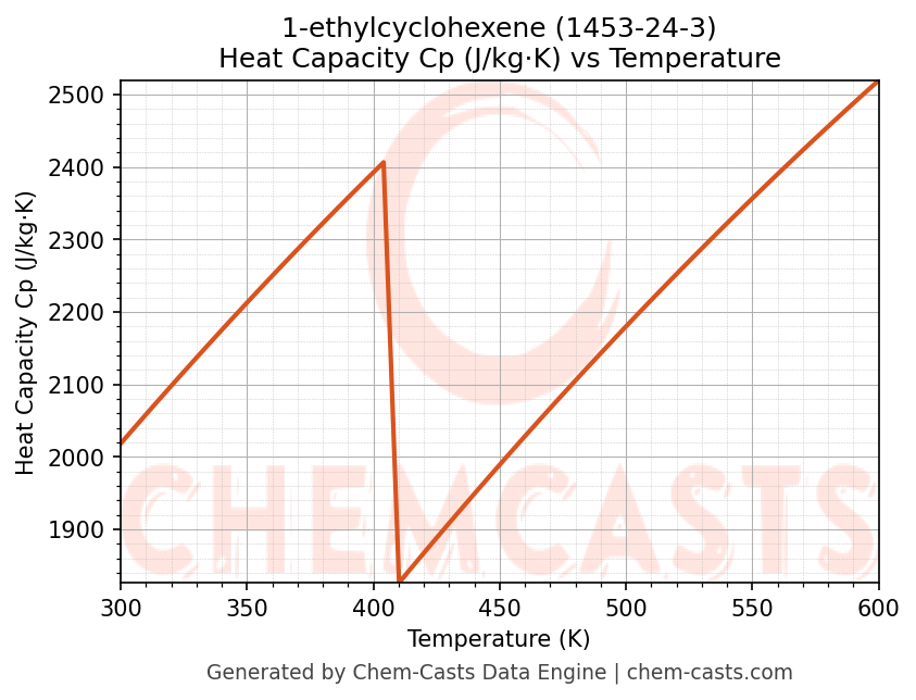 - Specific heat capacity (Cp) indicates the amount of energy required to raise the temperature of 1-ethylcyclohexene and is critical for energy balance and heat-exchanger design.
